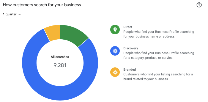 Knowing how users are finding for your client provides insight into brand awareness, how effective your local SEO is, and what types of searches to target. Usually, discovery search makes up the bulk of this metric, so we recommend optimizing for location-based discovery searches.