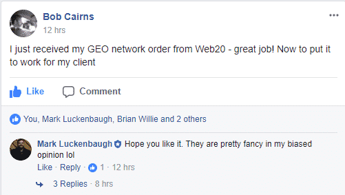 We create this network for your chosen location by using a local persona. This is a generic local organization or local association, which will be located in your targeted city and the account sign up name will include your chosen city name to really reinforce the local factor.