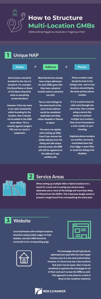 Most storefront locations already have completely unique NAPs, but the same should apply to service area based listings as well. Even if the visible address is removed from the listing, and unique service areas are added, the GMB will still be registered at the address where it was verified.