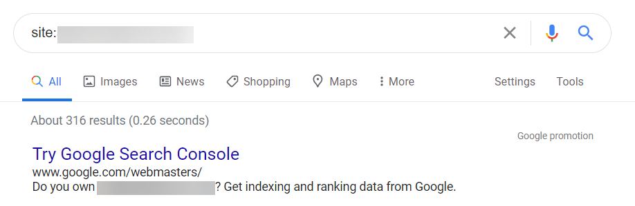 - Google search: In the search bar, type “site:[your domain]”. For example, “site:example.com”. This will show you all of the results for that domain. If you can’t find your site, or if there are fewer results than your published pages, that’s a sign that Google isn’t indexing your content.
