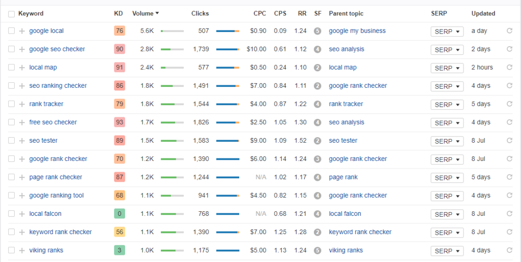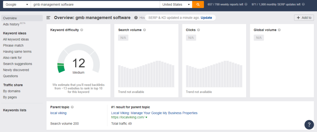 And just for fun, here’s the keyword difficulty score for ‘GMB Management Software’ which currently shows our brand as the parent topic!