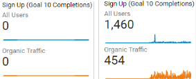 Another big goal that we had set for this campaign was to increase the number of new sign ups to our platform per month. A goal that most businesses are going to have in common. Starting out, we had no new sign ups for the first few months. This isn’t a great thing to see, but it’s at least somewhat expected for a new brand where we’re still building up the entity strength. Comparing that to our current goal metrics, we have a much better ROI that we can run with. Current monthly sign ups from organic search traffic stand at 454, about one quarter to one third of our 1460 total monthly signups.